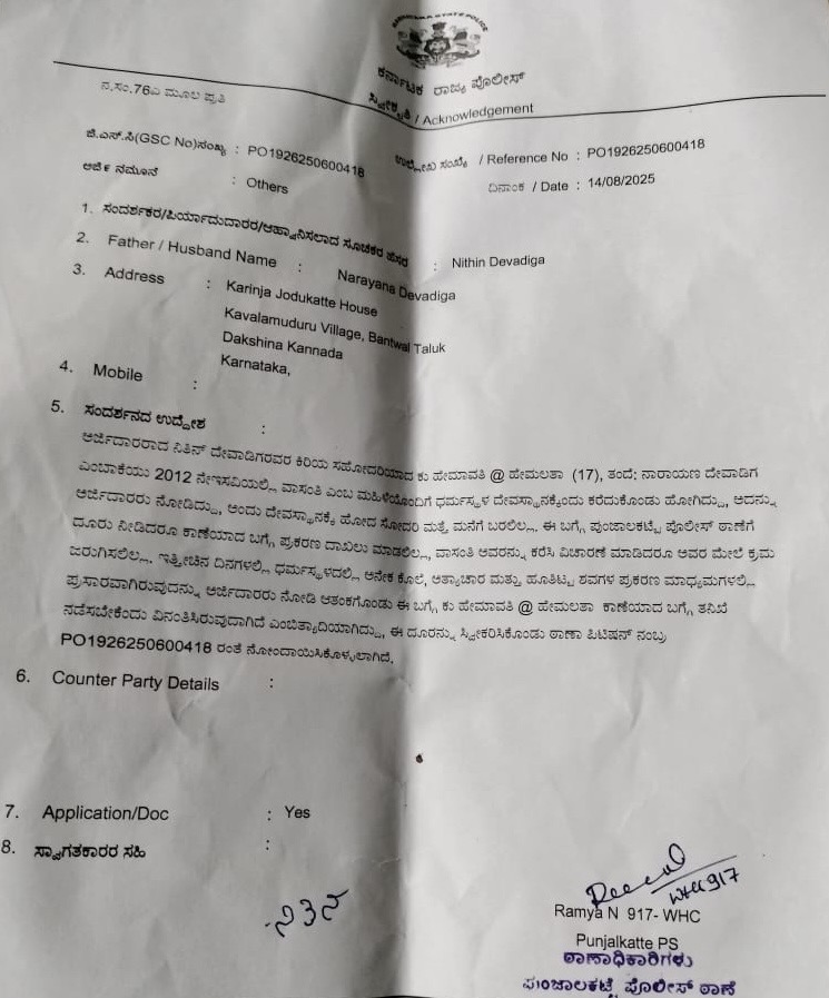 ಧರ್ಮಸ್ಥಳದಲ್ಲಿ 13 ವರ್ಷಗಳ ಹಿಂದೆ 17 ವರ್ಷದ ಬಾಲಕಿಯೊಬ್ಬಳು ಕಾಣೆಯಾದ ಪ್ರಕರಣ ಹೊಸದಾಗಿ ಬೆಳಕಿಗೆ ಬಂದಿದೆ. ಹಲವು ವರ್ಷಗಳಿಂದ ದೂರನ್ನು ಸ್ವೀಕರಿಸಲು ಸತಾಯಿಸಿದ್ದ ದಕ್ಷಿಣ ಕನ್ನಡ ಪೊಲೀಸರು ಆಕೆಯ ಸಹೋದರ ಸಲ್ಲಿಸಿದ ದೂರನ್ನು ಅಂತಿಮವಾಗಿ ಸ್ವೀಕರಿಸಿದ್ದಾರೆ.