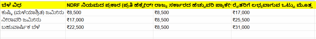 ಪ್ರವಾಹ ಪೀಡಿತ ರೈತರಿಗೆ ರಾಜ್ಯ ಸರ್ಕಾರವು ಪ್ರತಿ ಹೆಕ್ಟೇರ್‌ಗೆ ₹8,500 ಹೆಚ್ಚುವರಿ ಪರಿಹಾರ ನೀಡಲು ನಿರ್ಧರಿಸಿದೆ. ಈ ಹೆಚ್ಚುವರಿ ಪ್ಯಾಕೇಜ್‌ನಿಂದ ಬೆಳೆ ಹಾನಿ ಪರಿಹಾರದ ಒಟ್ಟು ಮೊತ್ತವು ದುಪ್ಪಟ್ಟಾಗಲಿದೆ.