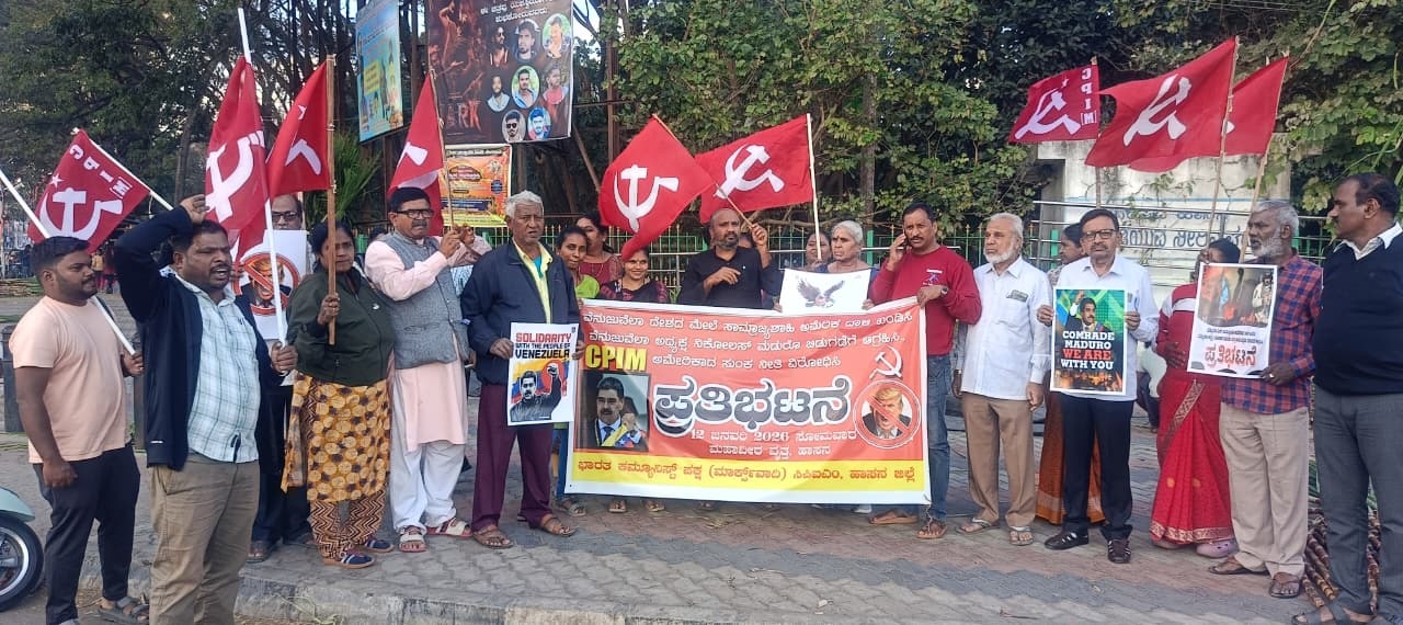 ಹಾಸನ: ವೆನುಜುವೆಲಾ ದೇಶದ ಮೇಲೆ ಸಾಮ್ರಾಜ್ಯಶಾಹಿ ಅಮೇರಿಕಾರಿಕಾ ನಡೆಸಿರುವ ದಾಳಿ ಅಂತರಾಷ್ಟ್ರೀಯ ನೀತಿಗಳಿಗೆ ವಿರುದ್ಧವಾದುದು ಮಾತ್ರವಲ್ಲ, ಅತ್ಯಂತ ದುರಾಕ್ರಮಣ ಮತ್ತು ಪ್ರಜಾಪ್ರಭುತ್ವ ವಿರೋಧಿ ನಡೆಯಾಗಿದೆ ಎಂದು ಖಂಡಿಸಿ ನಗರದ ಮಹಾವೀರ ವೃತ್ತದಲ್ಲಿ ಸಿಪಿಐಎಂನಿಂದ ಪ್ರತಿಭಟನೆ ನಡೆಸಿದರು. ಸಂಘಟನೆ ಜಿಲ್ಲಾ ಕಾರ್ಯದರ್ಶಿ ಹೆಚ್.ಆರ್. ನವೀನ್ ಕುಮಾರ್ ಮಾತನಾಡಿ, ವೆನುಜುವೆಲಾ ದೇಶದ ಮೇಲೆ ಅಮೇರಿಕಾದ ದಾಳಿ ಖಂಡಿಸಿ, ವೆನುಜುವೆಲಾದ ಅಧ್ಯಕ್ಷ ನಿಕೊಲೊಸ್ ಮಡುರೋ ಮತ್ತು ಅವರ ಪತ್ನಿಯ ಬಿಡುಗಡೆಗೆ ಆಗ್ರಹಿಸಿದರು, ಪ್ರಜಾಪ್ರಭುತ್ವದ ಪಾಠ ಹೇಳುವ ಅಮೇರಿಕಾ ತಾನೇ ಸರ್ವಾಧಿಕಾರಿಯಾಗಿ ವರ್ತಿಸುತ್ತಿದೆ ಎಂದು ಆರೋಪಿಸಿದರು. ಸ್ವತಂತ್ರ ಹಾಗೂ ಸಾರ್ವಭೌಮ ರಾಷ್ಟ್ರವಾದ ವೆನುಜುವೆಲಾದ ಮೇಲೆ ಏಕಾಏಕಿ ನುಗ್ಗಿ ಬಾಂಬ್ ದಾಳಿ ನಡೆಸಿ ನೂರಾರು ಜನರನ್ನು ಹತ್ಯೆ ಮಾಡಿರುವುದು ಹಾಗೂ ಅಧ್ಯಕ್ಷರನ್ನು ಅಪಹರಿಸಿರುವುದು ಅತ್ಯಂತ ಖಂಡನೀಯ ಎಂದು ಅವರು ಹೇಳಿದರು. ವೆನುಜುವೆಲಾದ ತೈಲ ಮತ್ತು ಖನಿಜ ಸಂಪತ್ತನ್ನು ತನ್ನ ವಶಕ್ಕೆ ಪಡೆಯುವ ಉದ್ದೇಶದಿಂದಲೇ ಅಮೇರಿಕಾ ಈ ದಾಳಿಗೆ ಮುಂದಾಗಿದೆ ಎಂದು ಆರೋಪಿಸಿದರು. ಅಮೇರಿಕಾದ ಬಂಡವಾಳಶಾಹಿ ವ್ಯವಸ್ಥೆ ಬಿಕ್ಕಟ್ಟಿಗೆ ಸಿಲುಕಿದ್ದು, ಅದರಿಂದ ಹೊರಬರಲು ಟ್ರಂಪ್ ನೇತೃತ್ವದಲ್ಲಿ ಇಂತಹ ಆಕ್ರಮಣಕಾರಿ ನೀತಿಗಳನ್ನು ಅನುಸರಿಸಲಾಗುತ್ತಿದೆ. ಇದು ಜಾಗತಿಕ ಶಾಂತಿಗೆ ಗಂಭೀರ ಅಪಾಯ ಉಂಟುಮಾಡುವಂತದ್ದು. ಸಮಾಜವಾದಿ ನಿಲುವು ಹೊಂದಿರುವ ವೆನುಜುವೆಲಾ ಹಾಗೂ ಕ್ಯೂಬಾ ದೇಶಗಳ ವಿರುದ್ಧ ಸುಳ್ಳು ಆರೋಪಗಳನ್ನು ಮಾಡಿ, ಆರ್ಥಿಕ ದಿಗ್ಬಂಧನ ಹೇರಲಾಗುತ್ತಿದೆ ಎಂದು ನವೀನ್ ಕುಮಾರ್ ದೂರಿದರು.