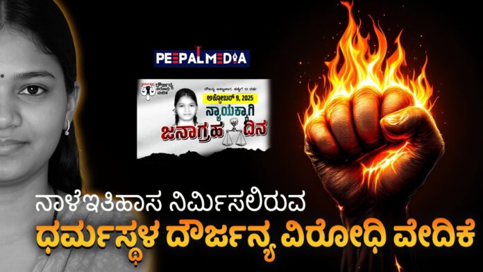ಬೆಂಗಳೂರು : ಧರ್ಮಸ್ಥಳ ಸೌಜನ್ಯ ಅತ್ಯಾಚಾರ-ಕೊಲೆಯಾಗಿ 13 ವರ್ಷ ಸಂದಿರುವ ಹಿನ್ನಲೆಯಲ್ಲಿ ಧರ್ಮಸ್ಥಳದ ಅತ್ಯಾಚಾರ, ಕೊಲೆ, ಭೂಕಬಳಿಕೆ, ದಲಿತರ ಮೀಸಲು ಭೂಮಿ ಕಬಳಿಕೆ, ಮೈಕ್ರೋ ಫೈನಾನ್ಸ್ ಬಡ್ಡಿ ದಂಧೆಯನ್ನು ವಿರೋಧಿಸಿ  ಧರ್ಮಸ್ಥಳ ದೌರ್ಜನ್ಯ ವಿರೋಧಿ ವೇದಿಕೆ ಅಕ್ಟೋಬರ್ 09, 2025 ರಂದು ನಡೆಸುವ ನ್ಯಾಯಕ್ಕಾಗಿ ಜನಾಗ್ರಹ ದಿನ ಇತಿಹಾಸ ನಿರ್ಮಿಸಲಿದೆ. ರಾಜ್ಯದ ಉದ್ದಗಲಗಳಲ್ಲಿ ಒಂದೇ ದಿನ 60 ಕಡೆಗಳಲ್ಲಿ ಜನಾಗ್ರಹ ಸಭೆ, ಆಗ್ರಹ ಪತ್ರ ಸಲ್ಲಿಕೆ,  ಸಮಾವೇಶ, ಪ್ರತಿಭಟನೆ, ಬಿತ್ತಿಪತ್ರ ಪ್ರದರ್ಶನ, ಕ್ಯಾಂಡಲ್ ಲೈಟ್ ಪ್ರದರ್ಶನಗಳು ನಡೆಯಲಿದೆ.