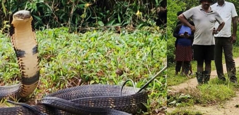 ಉರಗ ತಜ್ಞ ಹರೀಶ್ ಸಹಾಯದಿಂದ ಕಾಳಿಂಗ ಸರ್ಪವನ್ನು ಹಿಡಿಯಲಾಯಿತು.