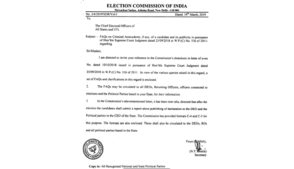 ಕೇಂದ್ರ ಚುನಾವಣಾ ಆಯೋಗವು 2019ರ ಚುನಾವಣಾ ಮಾರ್ಗಸೂಚಿಗಳಿಗೆ ಸಂಬಂಧಿಸಿದ ಪತ್ರವೊಂದನ್ನು ಇತ್ತೀಚೆಗೆ ಕೇರಳದ ರಾಜಕೀಯ ಪಕ್ಷಗಳಿಗೆ ವಿತರಿಸಿತ್ತು. ರಾಜಕೀಯ ಪಕ್ಷಗಳ ಪ್ರಚಾರ ಮತ್ತು ಅಭ್ಯರ್ಥಿಗಳ ಕ್ರಿಮಿನಲ್ ಹಿನ್ನೆಲೆಗೆ ಸಂಬಂಧಿಸಿದ ನಿಯಮಗಳ ಬಗ್ಗೆ ಈ ಪತ್ರದಲ್ಲಿ ಉಲ್ಲೇಖಿಸಲಾಗಿತ್ತು. ಆದರೆ, ಈ ಸರ್ಕಾರಿ ಪತ್ರದ ಮೇಲೆ ಬಿಜೆಪಿ ಪಕ್ಷದ ಸೀಲು ಇರುವುದು ಕಂಡುಬಂದಿದೆ.
