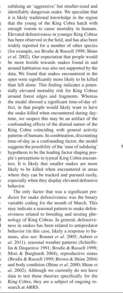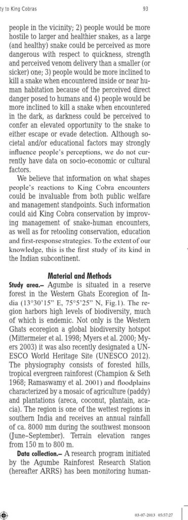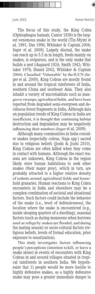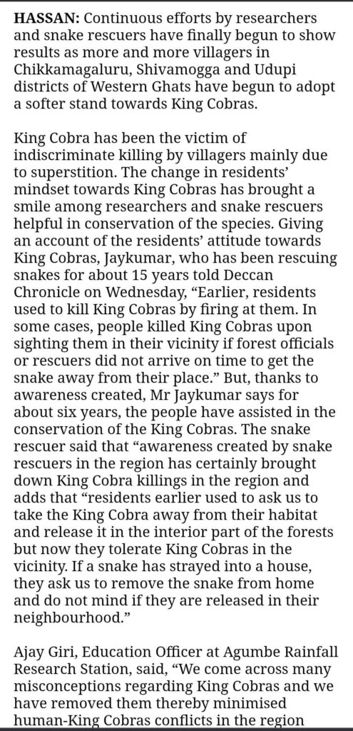 “..ಮಲೆನಾಡಿನಲ್ಲಿ ನಾಗರಹಾವು, ಕಾಳಿಂಗ ಸರ್ಪಗಳನ್ನು ಪೂಜಿಸುವ ಸಂಸ್ಕೃತಿ ಇದೆ. ಹೀಗಿರುವಾಗ ಕೊಲ್ಲುವುದು ದೂರದ ಮಾತು. ಆದರೆ ಸರ್ಪ ಸಂಶೋಧಕರ ಸೋಗಿನವರು ಸಂಶೋಧನಾ ಪ್ರಬಂಧಗಳಲ್ಲಿ ಮಂಡಿಸಿದ ವಿಚಾರ ಆಘಾತಕಾರಿಯಾದದ್ದು..” ಪರಿಸರ ಚಿಂತಕರಾದ ನಾಗರಾಜ್ ಕೂವೆ ಅವರ ಬರಹದಲ್ಲಿ