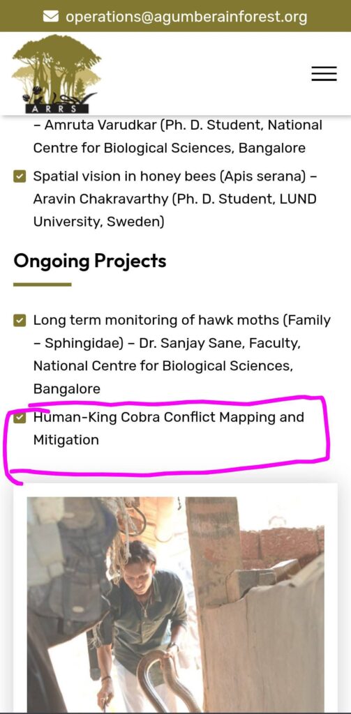 ಇವರ ಏಕಮುಖವಾದ ಸಂಶೋಧನೆಯ ಮೂಲಕ ‘ಕಾಳಿಂಗ ಸಂತತಿ ಕ್ಷೀಣವಾಗಿದೆ’ ಎಂದು ಪ್ರಬಂಧ ಪ್ರಕಟಿಸಿದ್ದಾರೆ. ಆದರೆ ಇವರು ಕಾರ್ಯ ನಿರ್ವಹಿಸುತ್ತಿರುವ ಆಗುಂಬೆಯ ಸುತ್ತ ಮುತ್ತಲಿನ ಪ್ರದೇಶಗಳಲ್ಲಿ ಪರಿಸ್ಥಿತಿ ತದ್ವಿರುದ್ಧವಾಗಿದೆ ಎಂದು ಬಹುತೇಕ ರೈತಾಪಿ ಜನರು ಅಭಿಪ್ರಾಯ ಪಡುತ್ತಾರೆ. ಇಲ್ಲಿ ಪರಸ್ಪರ ವೈರುಧ್ಯವಿದೆ. ಇಲ್ಲಿ ಸಂಶೋಧನೆಯ ವಿಶ್ವಾಸಾರ್ಹತೆಯೇ ಪ್ರಶ್ನಾರ್ಹ. ತಮ್ಮ ವ್ಯವಹಾರ ಹೆಚ್ಚಿಸಿಕೊಳ್ಳಲು ಈ ಸ್ವರೂಪದ ವರದಿಯನ್ನು ಹುಟ್ಟು ಹಾಕಿದ್ದಾರೆ ಎಂದು ಯಾರೇ ಸಂಶಯಪಟ್ಟರೂ ಅಚ್ಚರಿಯಿಲ್ಲ.