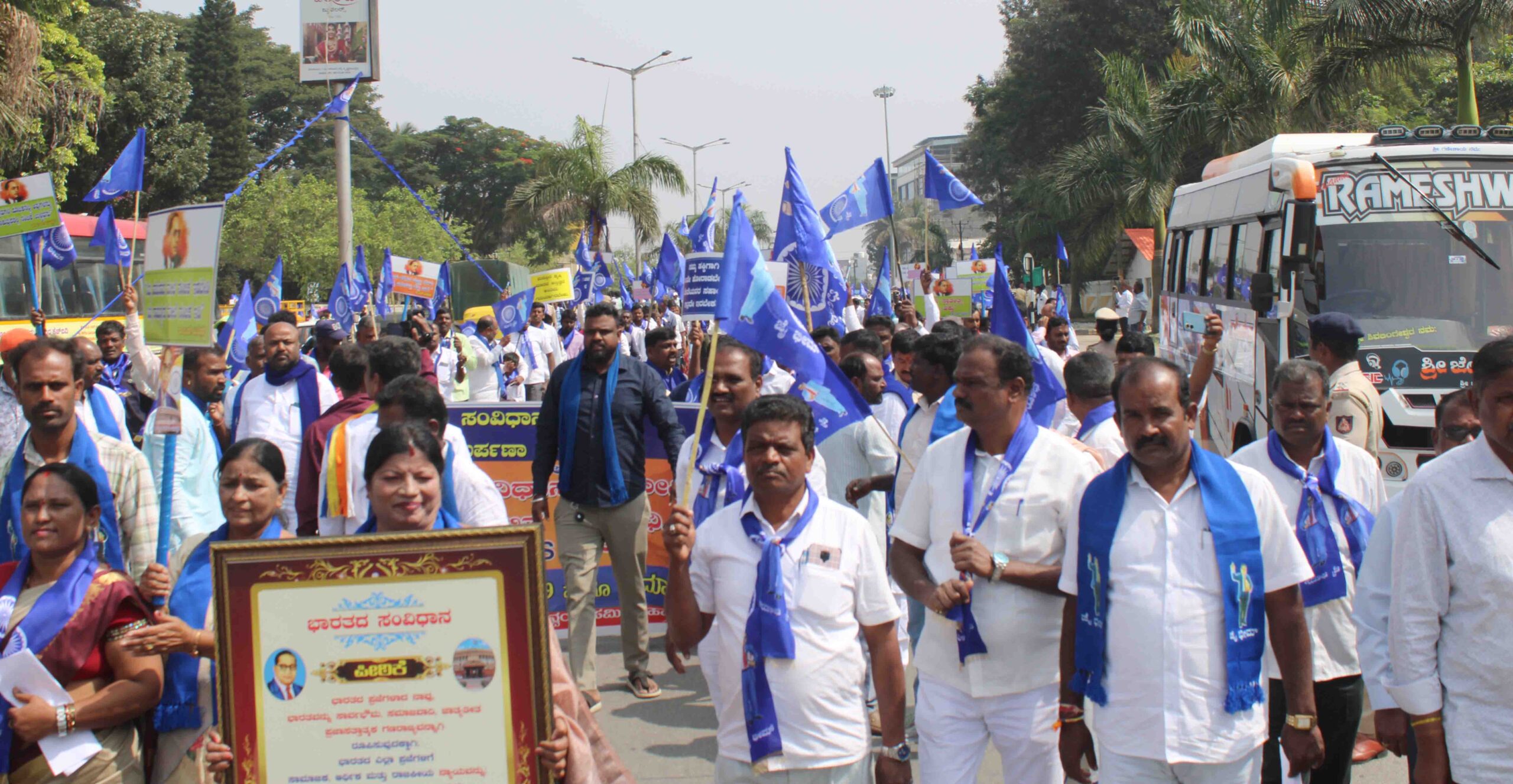 ಹಾಸನ : ಸಂವಿಧಾನ ಸಮರ್ಪಣಾ ದಿನದ ಅಂಗವಾಗಿ ನಗರದ ಜಿಲ್ಲಾಧಿಕಾರಿ ಕಚೇರಿ ಆವರಣದಲ್ಲಿರುವ ಅಂಬೇಡ್ಕರ್ ಪ್ರತಿಮೆ ಬಳಿ ಹಾಸನ ಜಿಲ್ಲೆಯ ದಲಿತ ಸಂಘಟನೆಗಳ ಸಮನ್ವಯ ಸಮಿತಿಯ ನೇತೃತ್ವದಲ್ಲಿ ವಿವಿಧ ಸಂಘಟನೆಗಳು ಒಟ್ಟಾಗಿ ಸೇರಿ ಬೃಹತ್ ಪ್ರತಿಭಟನೆ ನಡೆಸಿದರು. ಬಳಿಕ ನಗರ ಕೇಂದ್ರ ಬೀದಿಗಳಲ್ಲಿ ಮೆರವಣಿಗೆ ಮೂಲಕ ಸಂಚರಿಸಿ ಅಂಬೇಡ್ಕರ್ ಭವನದವರೆಗೆ ಸಾಗಿದರು.