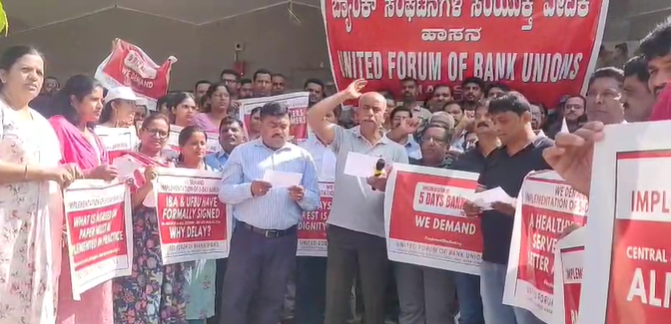 ಹಾಸನ : ಭಾರತೀಯ ಬ್ಯಾಂಕ್‌ಗಳ ಸಂಘಟನೆ (ಐಬಿಐ) ಹಾಗೂ ಬ್ಯಾಂಕ್ ಸಿಬ್ಬಂದಿಗಳ ಸಂಘಟನೆಗಳ ನಡುವೆ 2023ರಲ್ಲಿ ನಡೆದ 12ನೇ ದ್ವಿಪಕ್ಷೀಯ ಒಪ್ಪಂದದ ಪ್ರಕಾರ ವಾರದಲ್ಲಿ ಐದು ದಿನಗಳ ಬ್ಯಾಂಕಿಂಗ್ ವ್ಯವಸ್ಥೆಯನ್ನು ಜಾರಿಗೊಳಿಸುವಂತೆ ಆಗ್ರಹಿಸಿ ಬ್ಯಾಂಕ್ ಸಂಘಟನೆಗಳ ಸಂಯುಕ್ತ ವೇದಿಕೆ ದೇಶವ್ಯಾಪಿ ಬ್ಯಾಂಕ್ ಮುಷ್ಕರಕ್ಕೆ ಕರೆ ನೀಡಿದಂತೆ ಹಾಸನ ಜಿಲ್ಲೆಯಾದ್ಯಂತ ಎಲ್ಲಾ ಬ್ಯಾಂಕ್‌ಗಳು ಕಾರ್ಯನಿರ್ವಹಿಸದೆ ಸಂಪೂರ್ಣ ಬಂದ್ ಮಾಡಿ ಪ್ರತಿಭಟನೆಗೆ ನೌಕರರು ಇಳಿದರು.