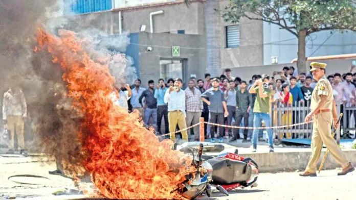ರಣರಂಗವಾದ ನೋಯಿಡಾ: ವೇತನ ಹೆಚ್ಚಳಕ್ಕೆ ಆಗ್ರಹಿಸಿ ಕಾರ್ಮಿಕರಿಂದ ಬೃಹತ್ ಪ್ರತಿಭಟನೆ; ವಾಹನಗಳಿಗೆ ಬೆಂಕಿ