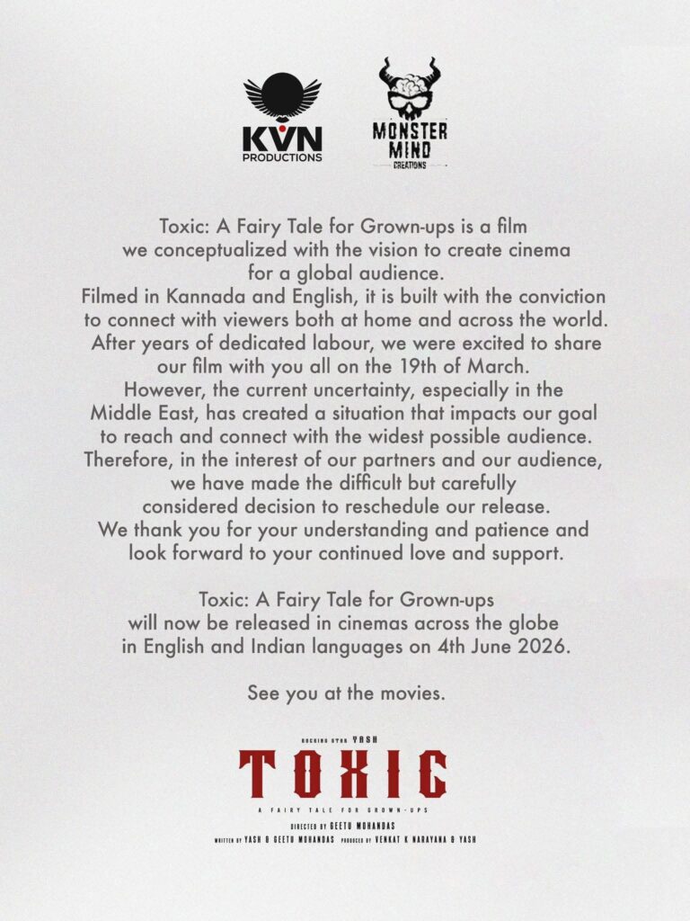 ಕೆಜಿಎಫ್ ಸರಣಿಯ ಭಾರೀ ಯಶಸ್ಸಿನ ನಂತರ ರಾಕಿಂಗ್ ಸ್ಟಾರ್ ಯಶ್ ಅಭಿನಯದ ಬಹುನಿರೀಕ್ಷಿತ ಸಿನಿಮಾ “ಟಾಕ್ಸಿಕ್” ಬಿಡುಗಡೆಯ ದಿನಾಂಕ ಮುಂದೂಡಲ್ಪಟ್ಟಿದೆ. ಬಿಡುಗಡೆಗೆ ಇನ್ನು ಕೆಲವೇ ದಿನಗಳು ಬಾಕಿ ಇರುವಾಗಲೇ ಚಿತ್ರತಂಡ ಈ ಮಹತ್ವದ ನಿರ್ಧಾರವನ್ನು ಪ್ರಕಟಿಸಿದೆ.